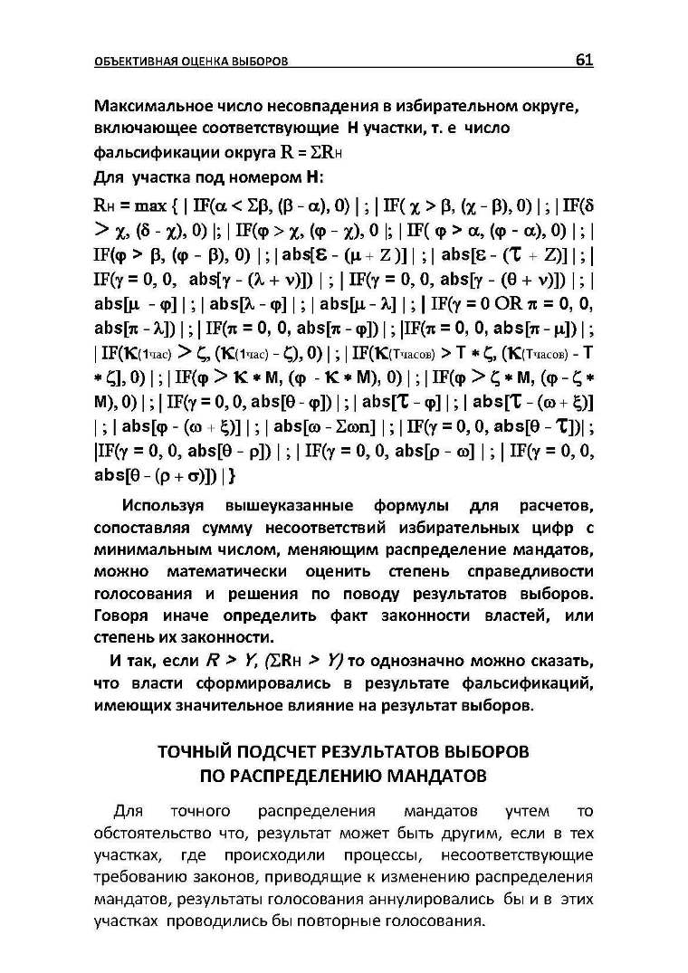 Используя вышеуказанные формулы для расчетов, сопоставляя сумму несоответствий избирательных цифр с минимальным числом, меняющим распределение мандатов, можно математически оценить степень справедливости голосования и решения по поводу результатов выборов. Говоря иначе определить факт законности властей, или степень их законности.
