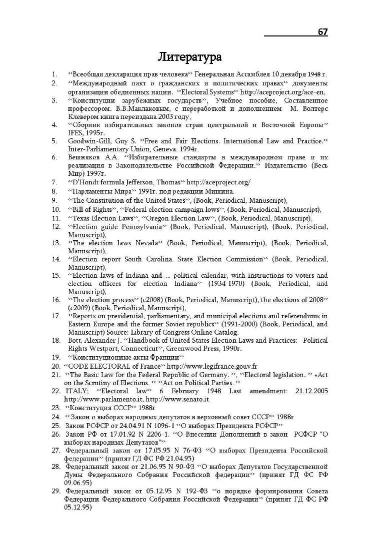 6. Вешняков A.A. <<Избирательные стандарты в международном праве и их реализация в Законодательстве Российской Федерации.>> Издательство (Весь Мир) 1997г.
