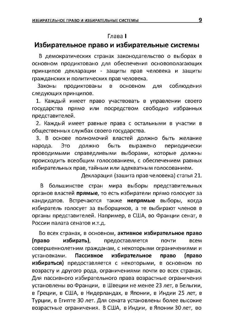 Во всех странах, в основном, активное избирательное право (право избирать), предоставляется почти всем совершеннолетним гражданам, с некоторыми ограничениями и установками. Пассивное избирательное право (право избираться) предоставляется с некоторыми, в основном по возрасту и другого рода, ограничениями почти во всех странах. Для пассивного избирательного права возрастные ограничения установлены во Франции, в Швеции не менее 23 лет, в Бельгии, в Греции, в США, в Нидерландах, в Японии, в Индии 25 лет, в Турции, в Египте 30 лет. Для сената установлены более высокие возрастные ограничения. В США, в Индии, в Японии 30 лет, во